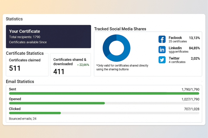 Unlike static PDFs, digital certificates generate interaction. Sendings, clicks and shares make them measurable assets within the funnel. As a result, certificates support the funnel end to end. They attract attention at the top, reinforce trust in the middle and enable retention and advocacy at the bottom.