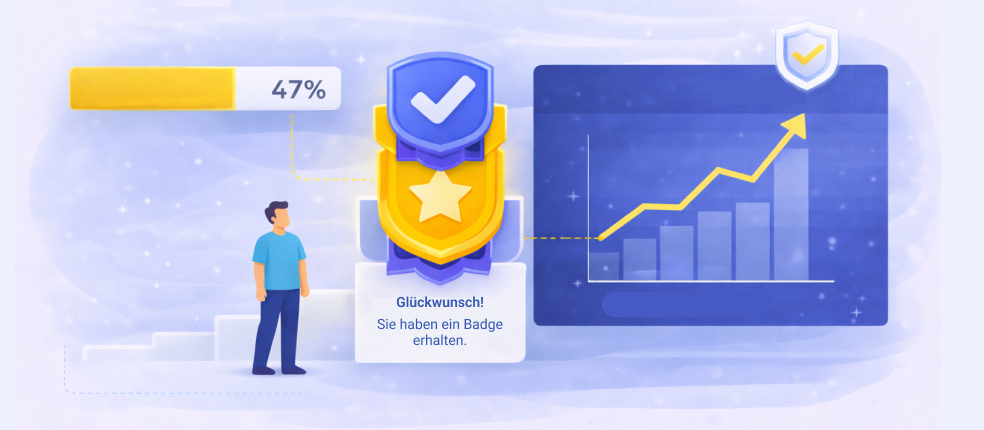 Studierende sammeln Badges über ihren gesamten Lernpfad. Sichtbarer Fortschritt motiviert zum Weitermachen. Completion Rate steigt um 30%+.