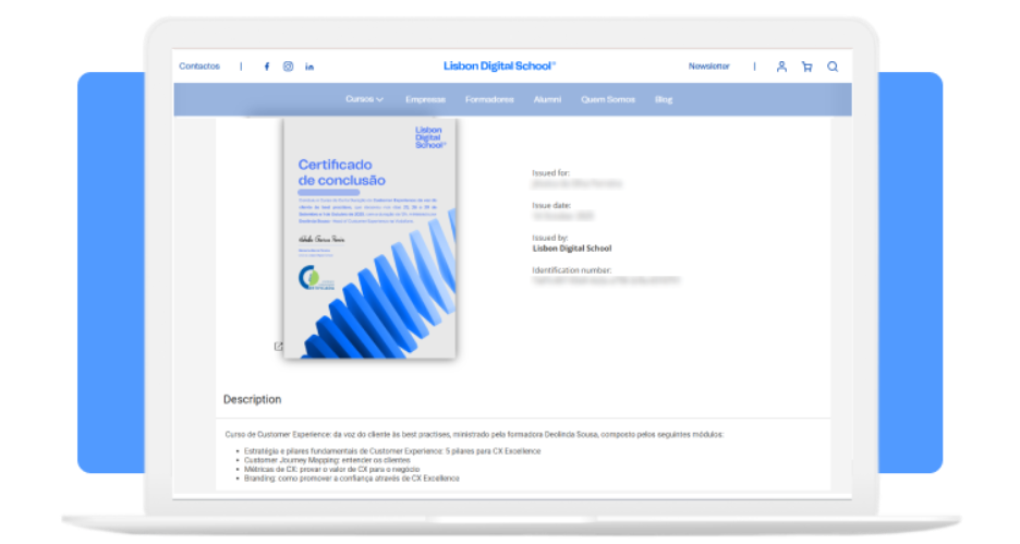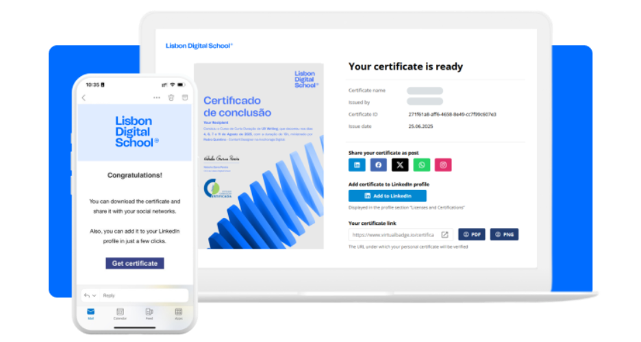 Für die Studierenden wurde der Erhalt ihres Zertifikats der Lisbon Digital School so einfach wie der Abschluss des Kurses selbst. Kurz nach Beendigung der Schulung erhielt jeder Teilnehmer automatisch eine personalisierte E-Mail mit direktem Zugriff auf sein digitales Zertifikat. Von dort aus konnten sie ihre Leistung mit nur einem Klick herunterladen, teilen oder verifizieren.