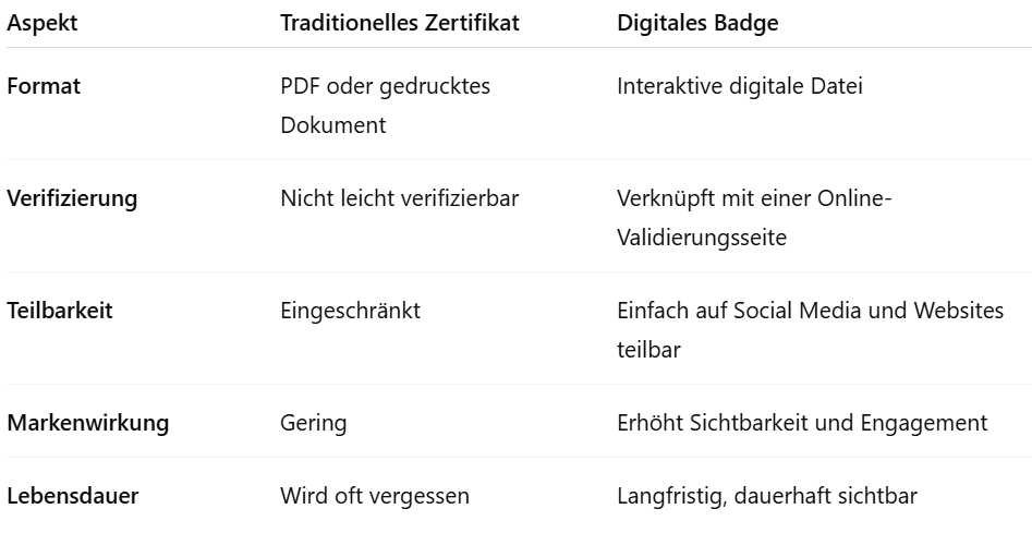Während Zertifikate statisch sind und oft in E-Mail-Anhängen oder Ordnern vergessen werden, sind digitale Badges dynamisch und interaktiv.